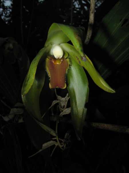 Found in Ecuador and Peru at elevations of 1400 to 2850 meters on grassy calcareous hillsides as a large sized, warm to cold growing terrestrial with pale yellow green, hard, leathery, corrugated, pyriform pseudobulbs with no spine after leaf fall and carrying 3, long, narrow, plicate, petiolate base leaves that blooms in the summer on an erect, 20" [50 cm] long, single flowered inflorescence with 5 bracts and carrying a scented flower