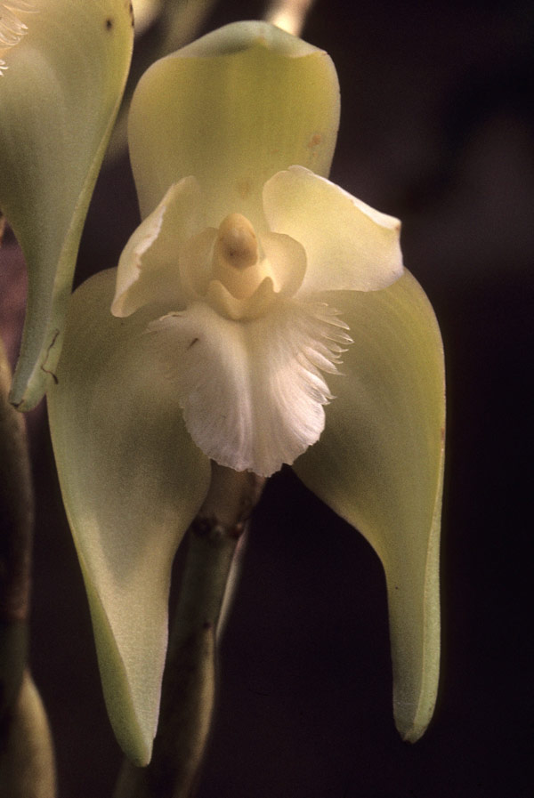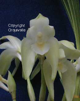 Found in Colombia, Ecuador and Peru at elevations of 1400 to 1900 meters as a large sized, warm to cool growing epiphyte or terrestrial with truncated, ovoid-conical pseudobulbs unspined after leaf fall and carrying 2 to3, plicate, tapering below into the petilate base leaves that blooms in the fall on an erect, 5.6 to 6.4" [14 to 16 cm] long, single flowered inflorescence with night fragrant flowers