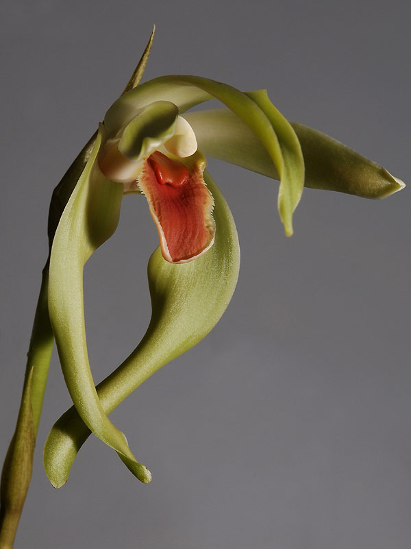 Found in Venezuela, Colombia, Ecuador and Peru in high open grasslands and damp woods at elevations of 2000 to 3100 meters as a large sized, cool to cold growing lithophyte, terrestrial or occasional epiphyte with flattened, tapering to the apex pseudobulbs without spines at leaf-fall and carrying plicaet, ribbed, narrowly elliptic, gradually narrowing below into the elongate, petiolate base leaves that blooms in the spring on an erect, to 3'4" [1 meter] long, single flowered inflorescence with flowers that do not have a fragrance