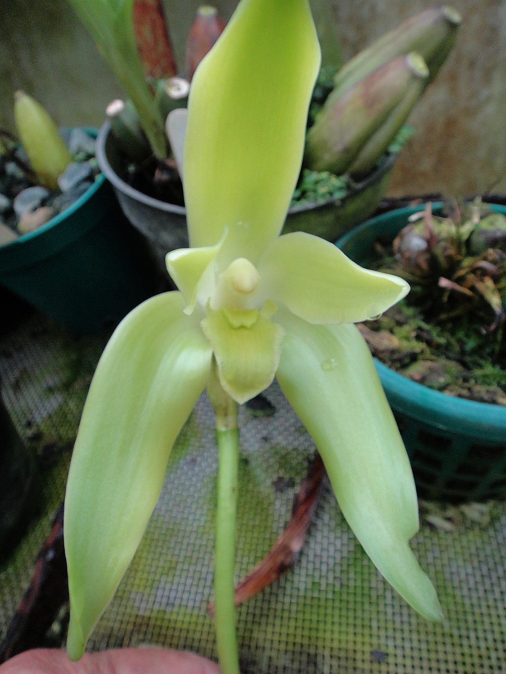 Found in Colombia in wet montane forests at elevations around 2000 meters as a large sized, cool to cold growing orchid with pale green, pyriform to tapered, slightly ridged pseudobulbs with no spines after leaf-fall and carrying 3, pale green, plicate, gradually narrowing below into the petiolate base leaves that blooms in the late winter and spring on an almost horizontal, 9.6 to 12.4" [24 to 31 cm] long, single flowered inflorescence with nocturnally fragrant flowers