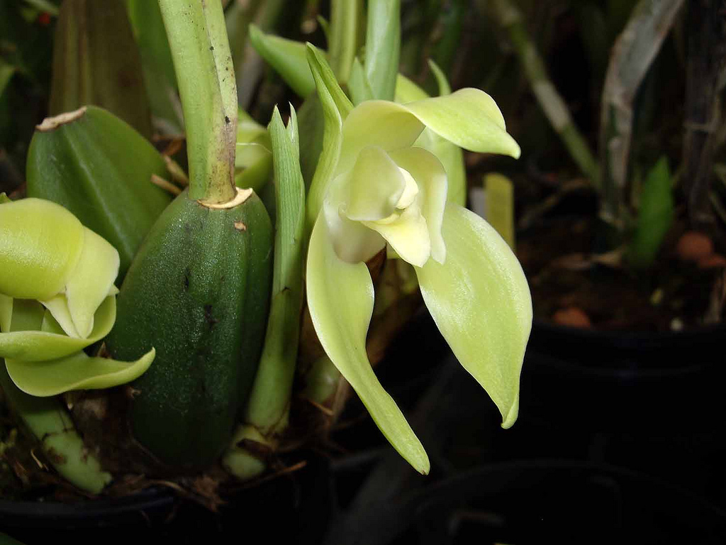 Found in southern Ecuador and northern Peru in drier areas at elevations around 650 meters as a large sized, hot growing terrestrial with oblong-ellipsoid pseudobulbs without spines after leaf-fall and carrying 3, broad, plicate leaves that blooms in the winter on an erect, 2.2" [5.5 cm] long, single flowered inflorescence with huge bracts and a large, cowl-like floral bract.