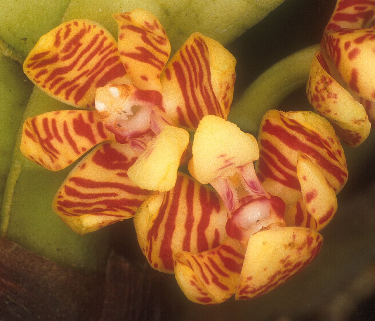 A monopodial, vandanaceous, epiphytic genus with about 10 species from Africa, the Himalayas, Malaysia and Southern China that can grow into large clumps of robust epiphytes or lithophytes with small spotted or barred flowers. The sepal and petals are similar, the lip is saccate or spurred, there are 4 pollina in two unequal parts with one long stipe and one very small viscidium.