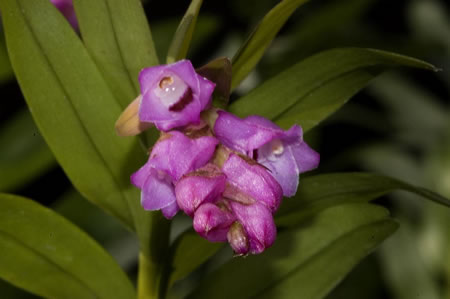Found in Guatemala and El Salvador at elevations around 800 to 2100 meters as a small to medium sized, warm to cold growing epiphyte with erect, arcuate, terete below, compressed above stem enveloped by sheaths and carrying distichous, oblong, obtuse, emarginate, dark green suffused with purple, slightly coriaceous leaves that blooms in the winter and spring on a terminal, short, descending, densely many flowered inflorescence