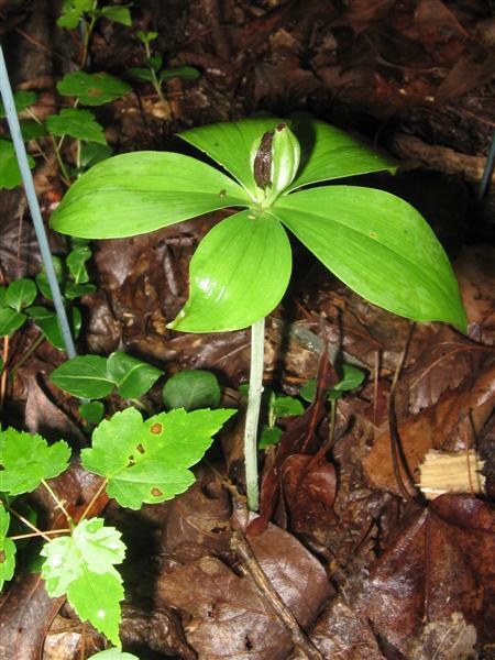Found from eastern Canada south to North Carolina and west to Missouri with a pale greenish, hollow, glaucous stem carrying a whorl of 5 to 6 glabrous, light green, elliptic, somewhat pointed apically leaves that blooms in the spring on a terminal, short to 2" [5 cm] long, single [rarely 2] flowered inflorescence without a floral bract.