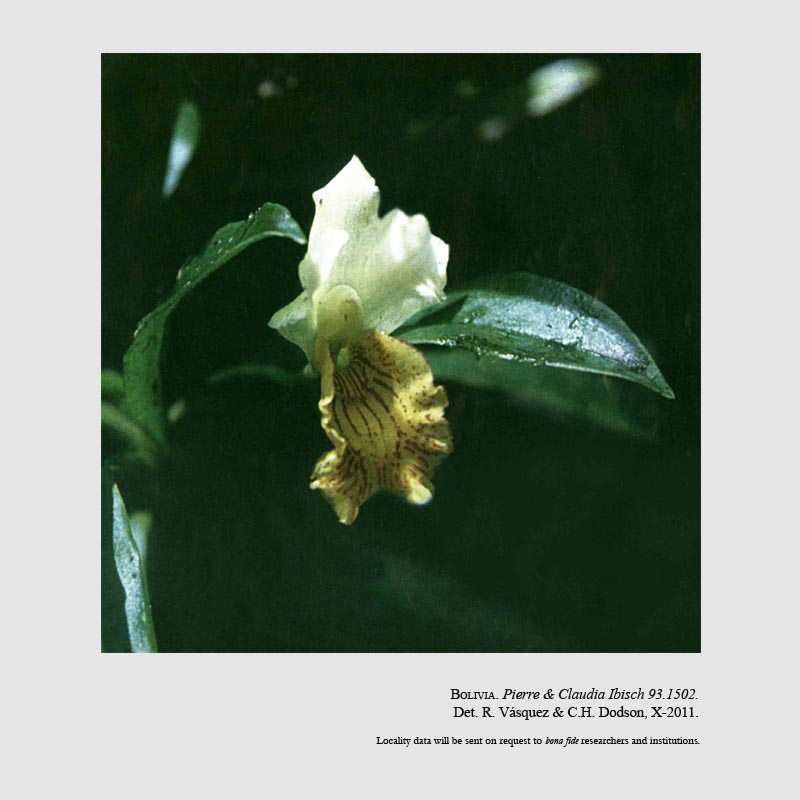 Found only in Bolivia at elevations of 2150 to 2350 meters as a medium sized, cold growing epiphyte with a few, held loosely in a fan, lanceolate, acute, articulated to the leaf bases below leaves that blooms in the late spring and early summer on an axillary, to 4" [10 cm] long, single flowered inflorescence.