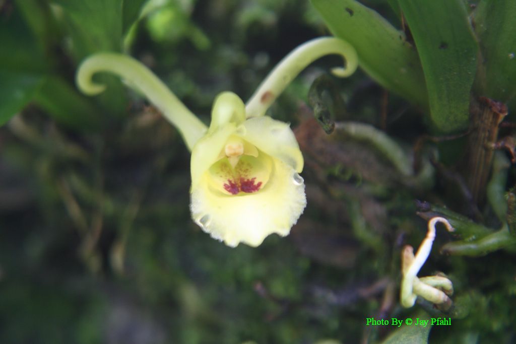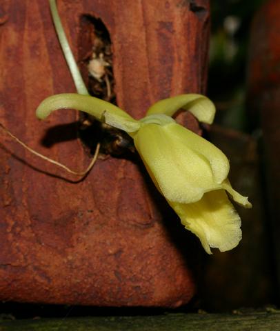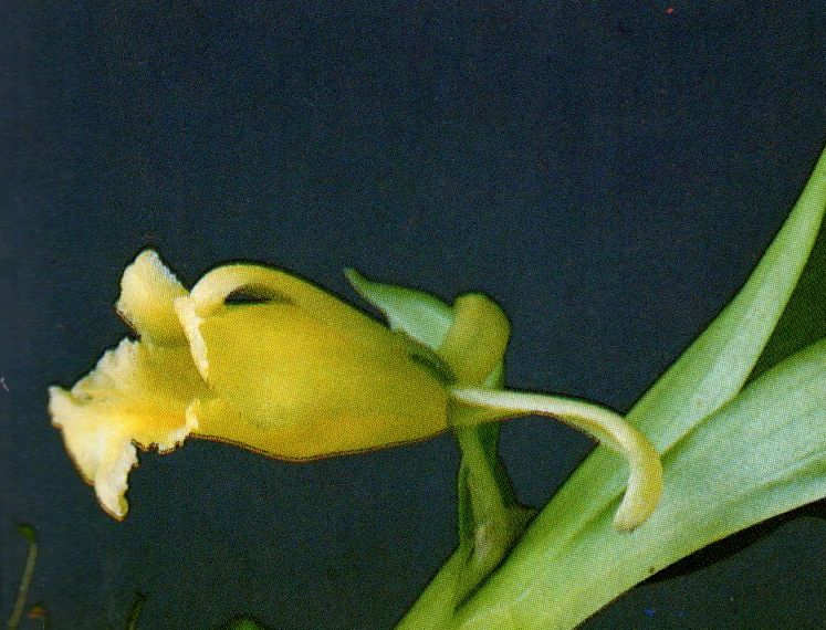 Found in Colombia as a small sized, warm to cool growing epiphyte with short pseudobulbs enveloped completely by distichous, imbricate, leaf-bearing sheaths and carrying oblong-ellitptic, acuminate leaves that blooms in the winter and spring on a lateral, arising through the axils of the leaf-bearing sheaths, 1.6 to 2.4" [4 to 6 cm] long, single flowered inflorescence