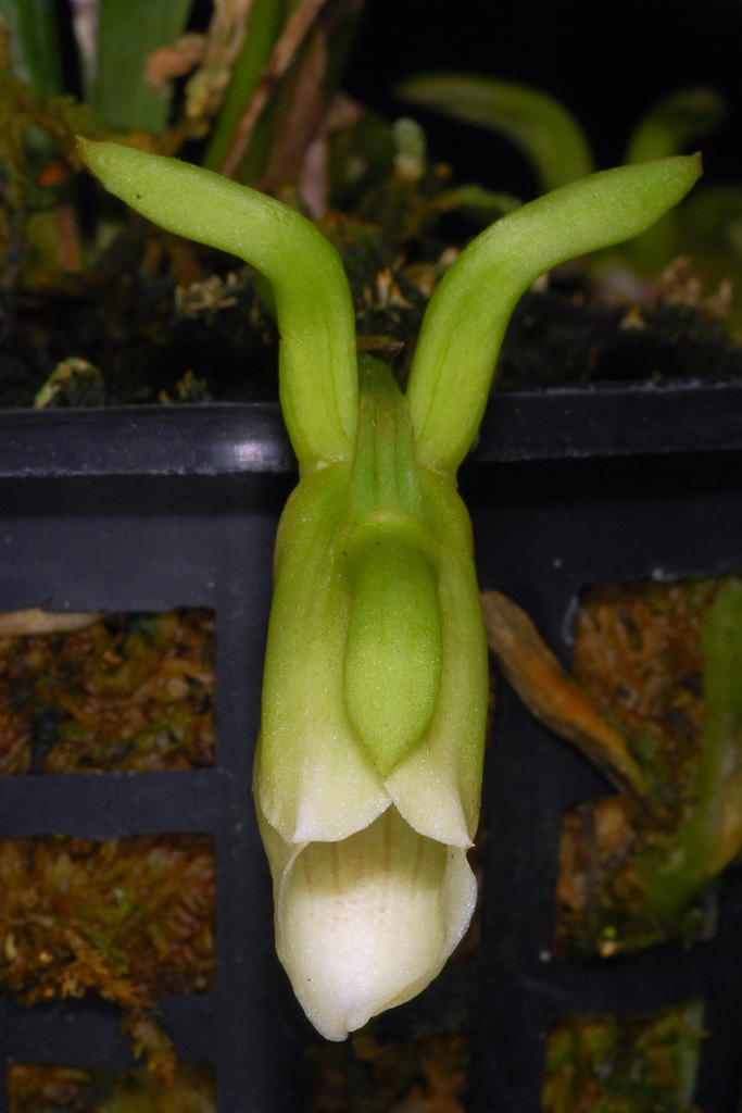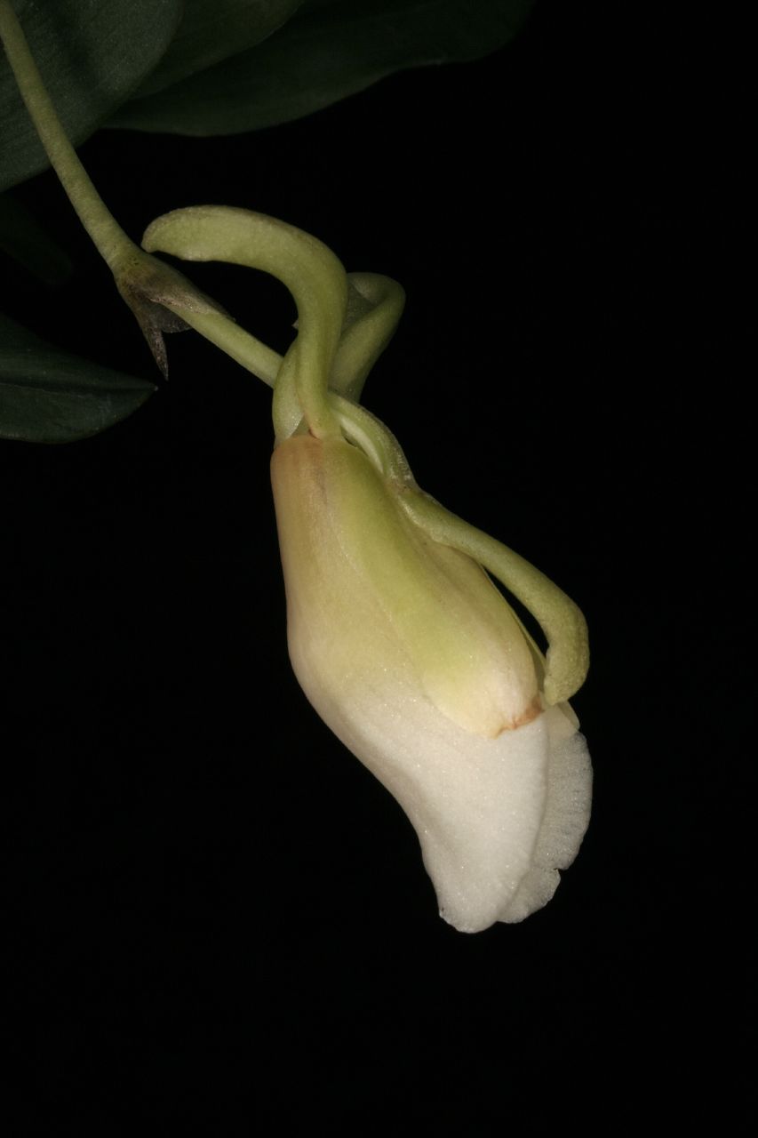 Found in Colombia Ecuador and Peru in wet montane forests at elevations of 800 to 2000 meters as a caespitose, fanshaped epiphyte with no psuedobulbs, oblanceolate, tapered to the conduplicate petiolate base, acute, graduating in size from the bottom to the top leaves that blooms on a laxly arching, 2 1/4" [6 cm]long, single flowered scape with the flowers held below the leaves occuring at various times as the new growths mature but in nature in the spring. The fan-shape plant in this species is less distinct than in other Chondrorhyncha.