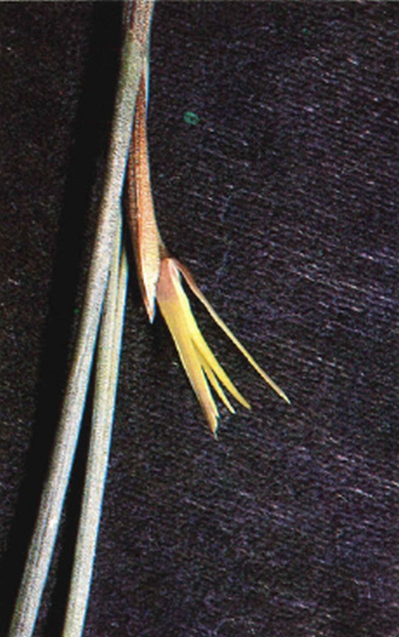 Found in Chiapas state of Mexico, Guatemala and Honduras in montane rainforests and dwarf forests at elevations of 1300 to 1650 metrs as a giant sized, cool growing, hanging epiphyte with pendent, terete, slender, straight stems carrying 1 to 6 per stem [usually 1 to 2], terete, gradually attenuate, adaxially sulcate, fleshy, dark green, punctulate with white leaves that blooms in the later spring on a terminal, sessile, single flowered inflorescence subtended by a leaf -like, apical bract and three other bracts, of which the two outermost are subequal, conduplicate, subopposite-imbricating, yellowish - brown, chartaceous, oblong- elliptic to oblong-triangular when spread, acute to acuminate, keeled dorsally along the mid-line, rugose and more or less prominently veined, the innermost much smaller and completely hidden, scarious, brown, obliquely funnel-form, acuminate and rather small and completely hidden inside the large bracts of the inflorescence, membranous, greenish-white, obliquely funnel-form , obtuse, shortly apiculate floral bracts and carrying a downward pointing, usually cleistogamous, occasionally opening but self -pollinating, odorless, somewhat fleshy flower.