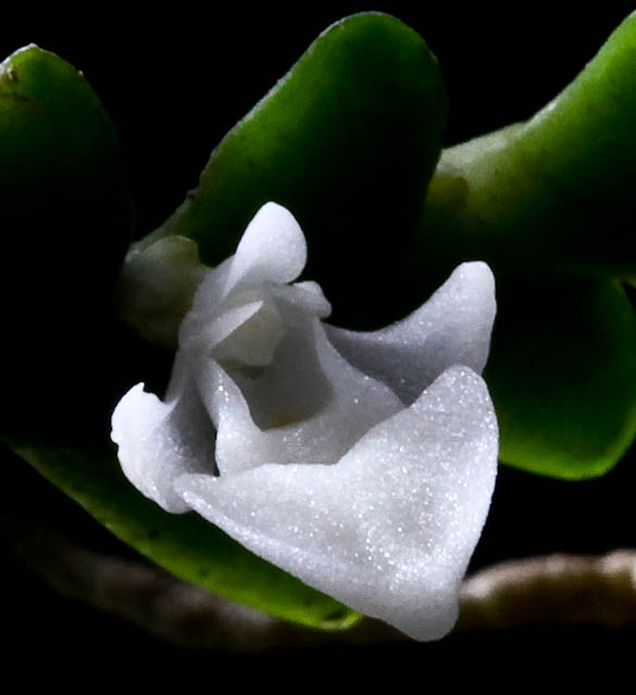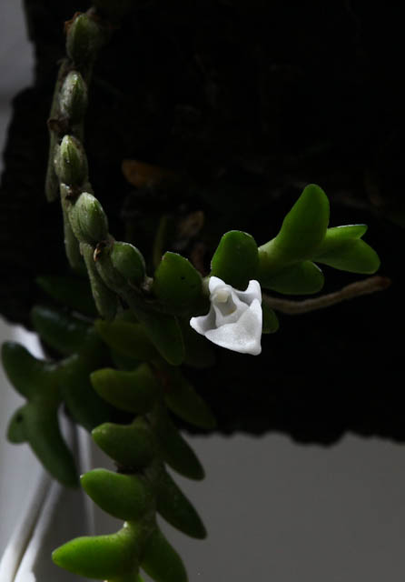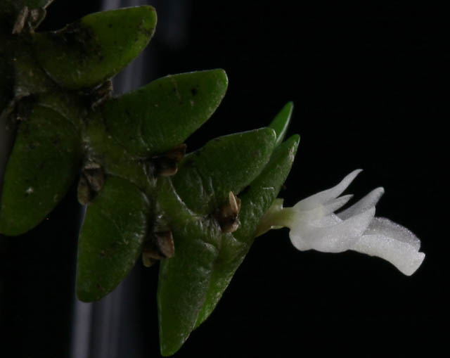 Found in Sabah Borneo in lower montane forests at elevations of 1200 to 1700 meters as a mini-miniature sized, cool growing epiphyte with pendent, simple to branching stems enveloped completely by imbricating leaf bases carrying, distichous, ensiform, laterally compressed, acute, succulent, hard-textured leaves that blooms in the late summer and early fall on a lateral, axillary, sessile, successively single flowered inflorescence