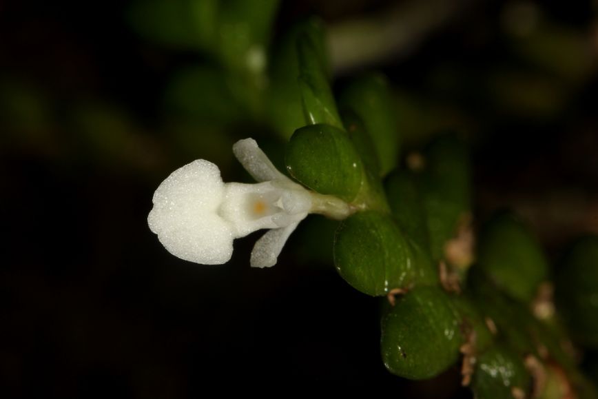 Found in Sabah Borneo in forests at elevations of 1100 to 1500 meters as a mini-miniature sized,cool growing epiphyte with a stem enveloped by imbricate leaf bases carrying linear, upper side curved, lower side straight, acute leaves that blooms on very short single flowered inflorescence