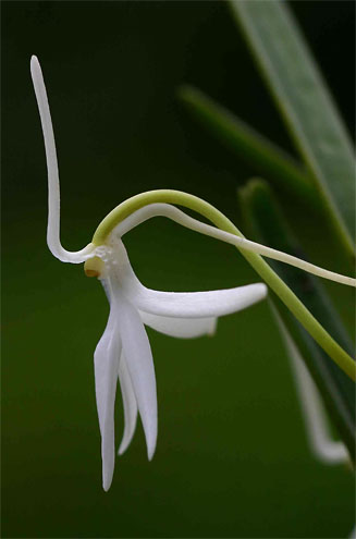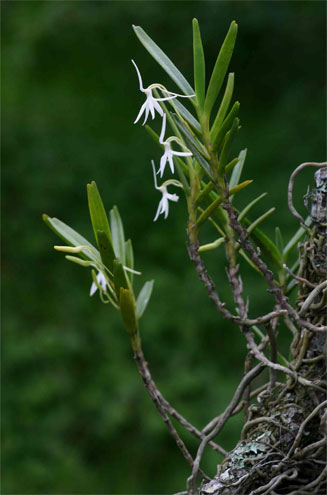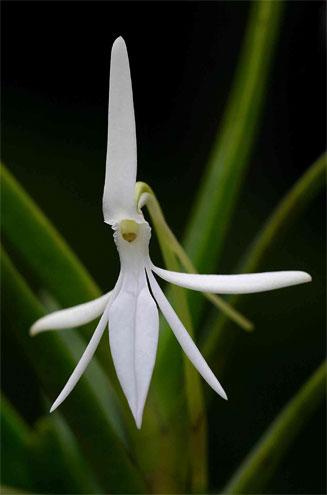 Found in Kenya, Tanzania, Malawi, Mozambique, Zimbabwe and Natal and Victoria states of South Africa in riverine forests at elevations of 600 to 1800 meters as a medium sized, warm to cool growing epiphyte and occasional lithophyte with a woody stem carrying up to 16, distichous, strap-shaped, folded, thick and leathery, obtusely bilobed apically, dark green leaves and blooms on an axillary, 3 to 4" [7.5 to 10 cm] long, single flowered inflorescence occuring in the summer to early fall with glisteningly white flowers that smell of violets and fade to an apricot color in time.