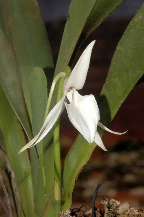 Found in northern Madagascar in mossy montane forests at the side of streams on trunks and large branches of trees at elevations of 1200 to 1500 meters as a large sized, cool growing epiphytic orchid with an very thick, flattened, elongate stem carrying a fan of 11 to 17, large, ligulate, leathery, obtusely bilobed leaves that blooms in the fall on a basal, 6 to 8" [15 to 20 cm] long, single flowered inflorescence enveloped basally by 3 apiculate sheaths and oblong-apiculate floral bracts all carrying a large, fleshy, night scented flower with a short spur.