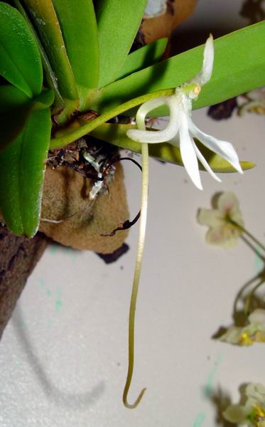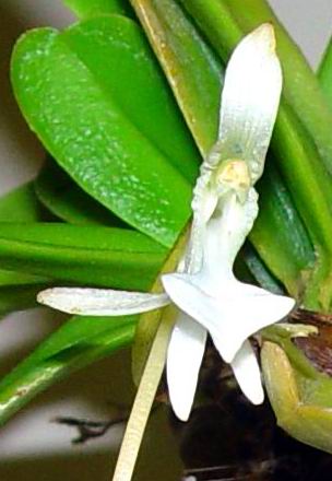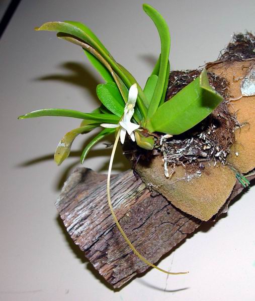 Found in Madagascar on basalt rocks at elevations around 1200 meters as a small sized, cool growing lithphyte or epiphyte with an erect, thick stem carrying numerous, ligulate, coriaceous, rigid, leathery leaves that blooms in the spring on an axillary, peduncle .8 to 1" [2 to 2.5 cm] long, 2.8 to 3.2" [7 to 8 cm] long overall, 1 to few flowered inflorescence enveloped basally by 2 to 3 sheaths and carrying white flowers with a greenish spur.