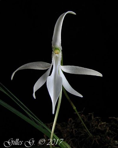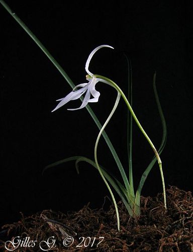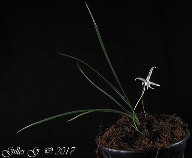 Found in east northeastern Madagascar in evergreen rain forests at elevations around 900 meters as a large sized, warm growing, stemless epiphyte with a dense tuft of 3 to 5, linear, semi-cylindric, canaliculate, obtusely bilobed apically leaves with disintegrating short, folded leaf sheaths that blooms in the later summer on an, arising from beneath the leaves, peduncle slender, 1 to1.2" [2.5 to 3 cm] long, single flowered inflorescence with a tubular, shorter than the ovary carrying a white, fleshy flower.