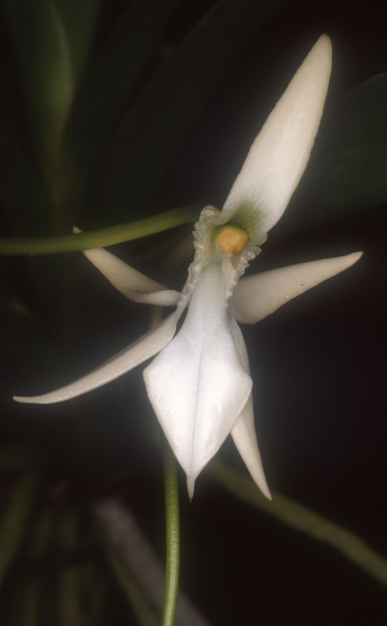 Found in central to southern Madagascar in damp forests at elevations around 1500 to 2400 meters as a medium to large sized, cool to cold growing lithophyte and occasional epiphyte with a robust, erect stem carrying 8 to 10, ligulate, unequally bilobed apically, conduplicate towards the base leaves that blooms in the late spring and summer on an axillary or through old leaf sheaths, 1.2 to 3.2" [3 to 8 cm] long, single flowered inflorescence with a few basal sheaths and a thin, tubular, shorter than the ovary floral bract.