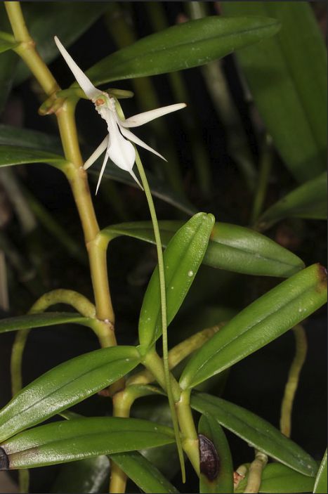 Found in southeastern Madagascar in coastal forests at elevations of 20 to 500 meters as a hot growing epiphyte with a creeping stem carrying 2 ranked, oblong-lanceolate, basally folded leaves a that blooms in the summer on a peduncle half enveloped by 3 to 4 sheaths, .6 to 1.8" [1.5 to 4.5 cm] long, single flowered inflorescence with a tubular, shorter than the ovary floral bract and carrying a white flower