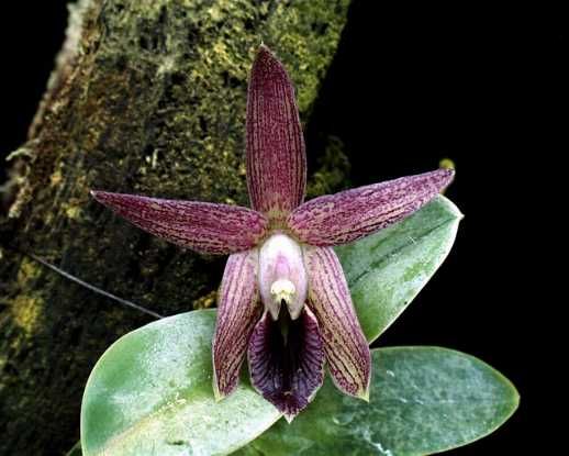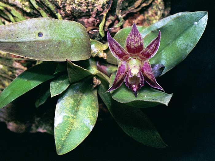 Found in Peru and Ecuador at elevations of 1500 to 3500 meters in very wet, montane forests, found very low on tree trunks in deep shade with constant moisture as a small sized, cool to cold, pendant growing species with stems that are enveloped by 4 to 5 distichous, imbricating, lanceolate, ballooning sheaths graduated in size from the base to the apex ballooning over the base of the oblong to broadly elliptic, conduplicate below into the clapsing base leaves carrying fleshy flowers close in to the leaf base, inside the midrib of the leaf and that is partially concealed by the uppermost sheath that blooms in the spring and summer terminal, subsessile, very short, 1 to 4 succesively flowered, racemose inflorescence arising on mature canes.
