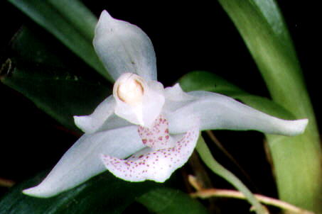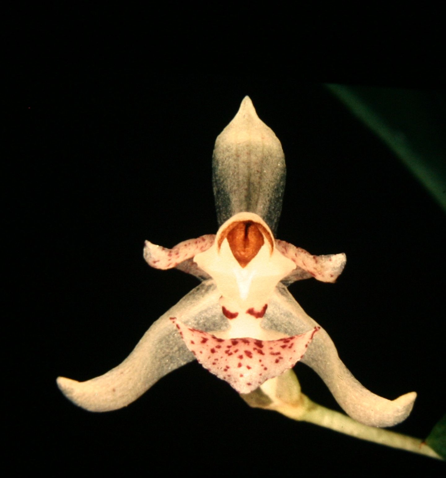 Found in Costa Rica and Panama in moist premontane forests at elevations around 450 to 1200 meters as a small sized, hot to cool growing epiphyte with a fan shaped growth of 3 to 4, oblong, acuminate, narrowing below into the conduplicate base leaves and blooms in the summer and early fall on 1 to 2, basal, slender, semipendant, 1.4" [3.5 cm] long, single flowered inflorescence
