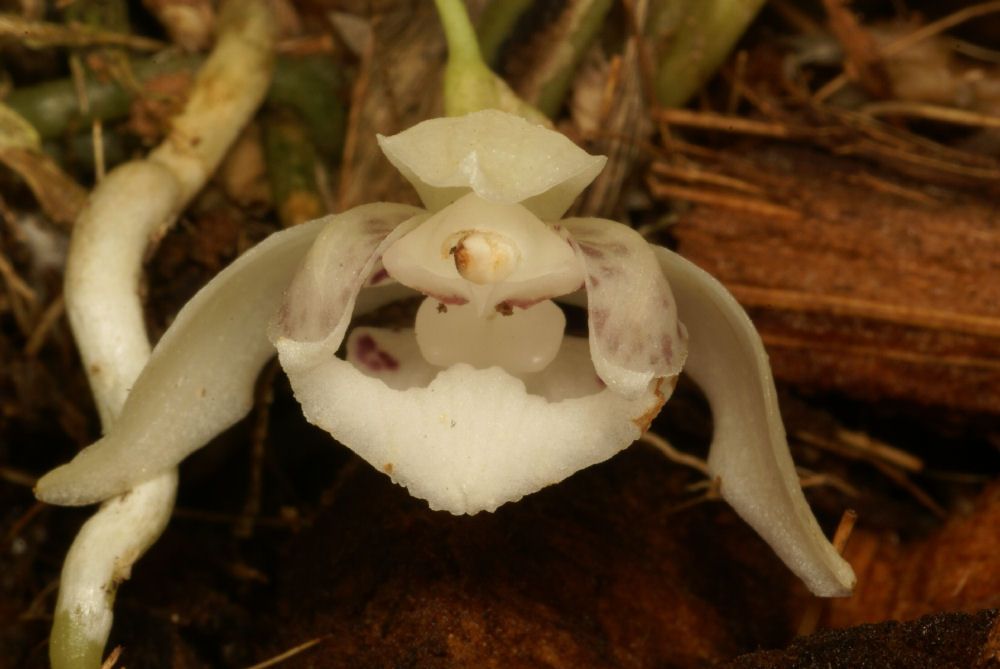 Found in Panama in very wet forests at elevations of 800 to 900 meters as a miniature to small sized, warm growing epiphyte with a fan of 3 to 4, elliptic, acute or acuminate, narrowing below into the narrow conduplicate base leaves that blooms in the late spring through late summer on a basal, .68 to .88" [1.7 to 2.2 cm] long, single flowered inflorescence with 2 bracts