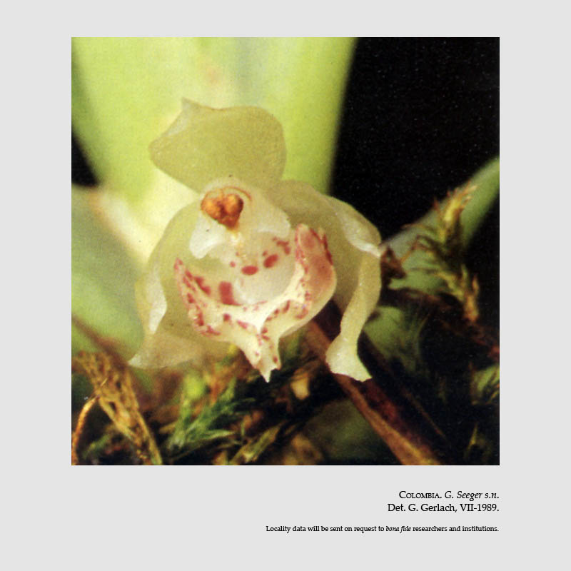 References W3 Tropicos, Kew Monocot list , IPNI ; Lankester's Epidendra Website CR ; *Orchideen 41: 45. 1990; Rudolf Schlechter Die Orchideen Band 1B lieferung 26 1584 - 1648 Brieger 1992; Native Colombian Orchids Vol 5 COS 1994 photo ok; Orchids From The Serrania Del Baudo Misas Urreta 2005 drawing/photo ok; Huntleya and Related Orchids Harding 2008 photo fide; Orchids A Colombian Treasure Vol 3 Ortiz & Uribe 2019 photo fide;