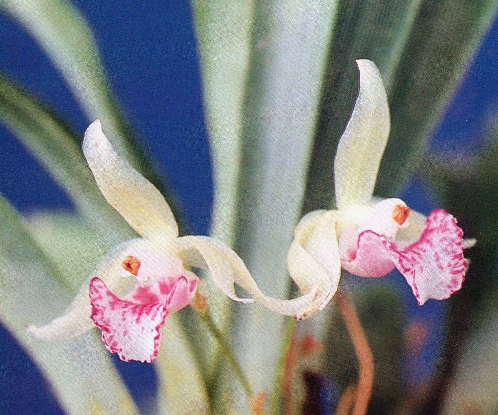 Found in Choco' department Colombia in primary forests at elevations around 100 meters as a small sized, hot growing epiphyte with a loose fan of a few, long-elliptic leaves that blooms in the summer on an axillary, pendulous, oblique, 1.6 to 2" [4 to 5 cm] long, single flowered inflorescence.