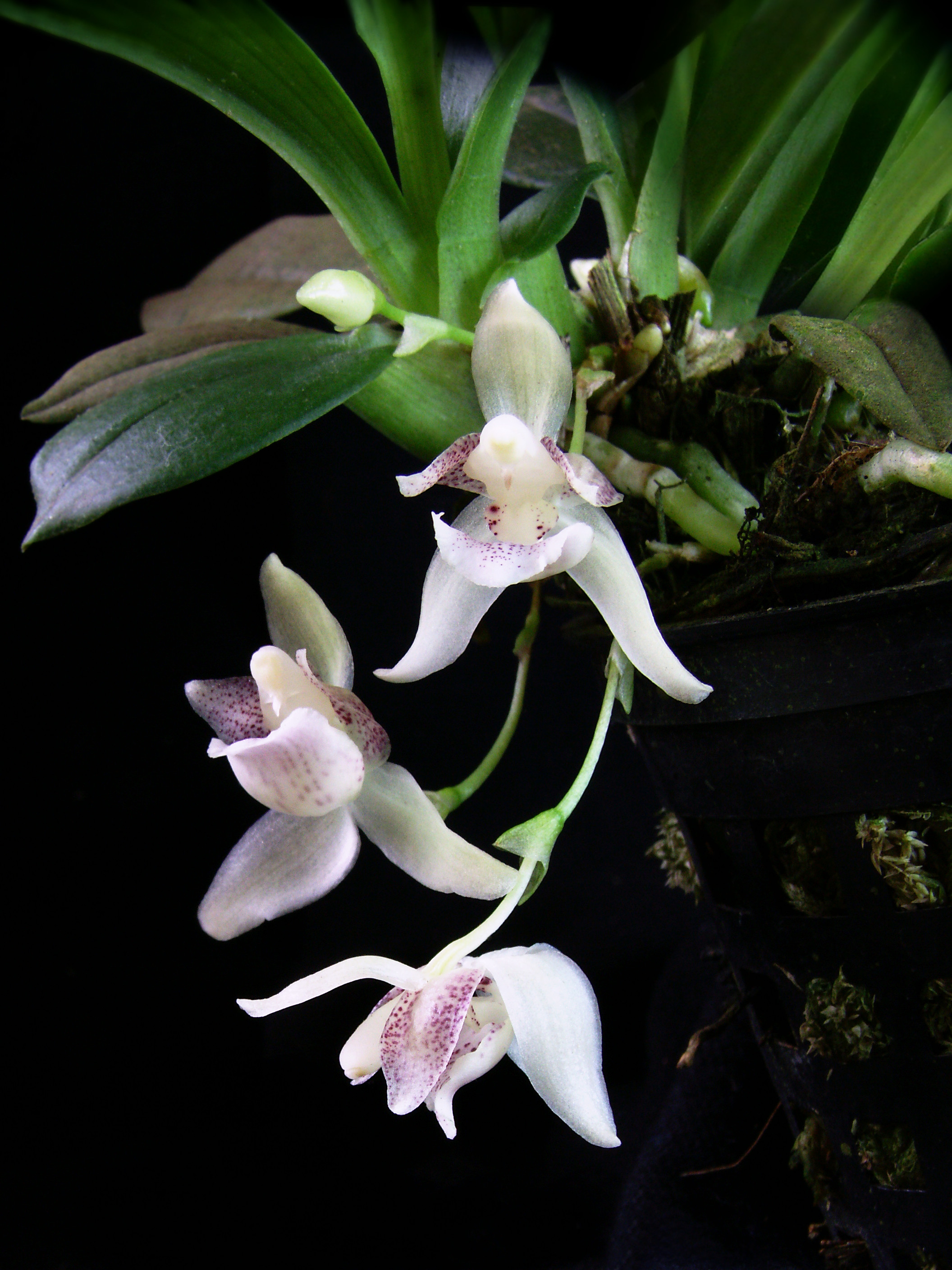 Found from Nicaragua, Costa Rica and Panama in shaded, wet, montane forests at elevations 50 to 1350 meters as a miniature sized, hot to cool growing epiphyte with no pseudobulbs but has erect and spreading, up to 5, arranged in a fan-shape, petiolate, articulate to the leaf sheaths, thin, elliptic-lanceolate, carinate beneath, acute leaves that blooms at any time of the year on a lateral to descending, .8 to 1.6" [2 to 4 cm] long, single flowered inflorescence.