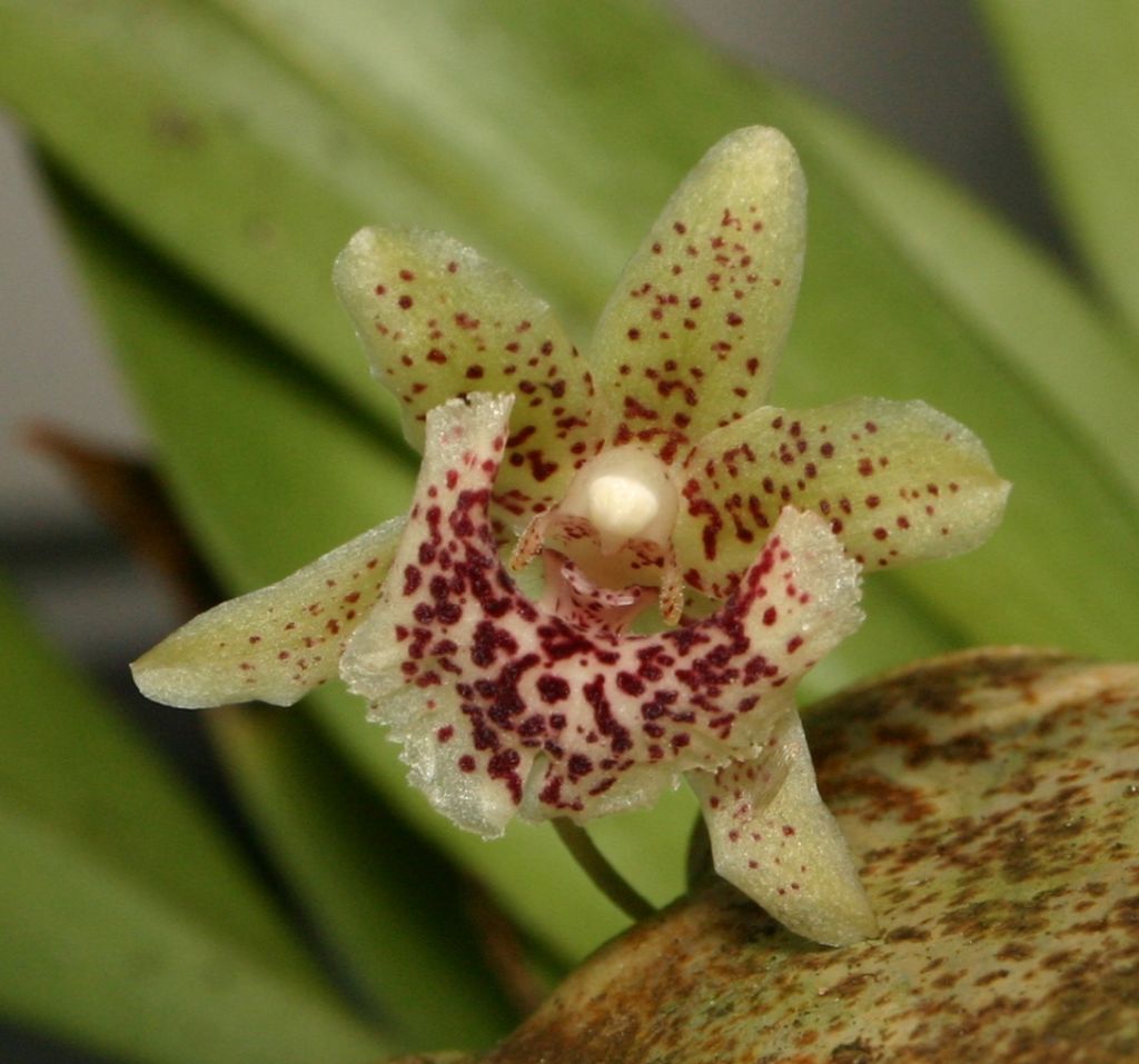 Found in Peru in wet montane forests low on tree trunks at elevations around 1000 to 1700 meters as a miniature sized, cool growing epiphyte with fan shaped growths giving rise to linear-lanceolate, acuminate, grey-green, attenuate to the narrow conduplicate petiolate base leaves that blooms in the fall in cultivation on a horizontal, to 1.6" [4 cm] long, single flowered inflorescence with a bract near the middle and two infundibular, much shorter than the ovaries floral bracts.