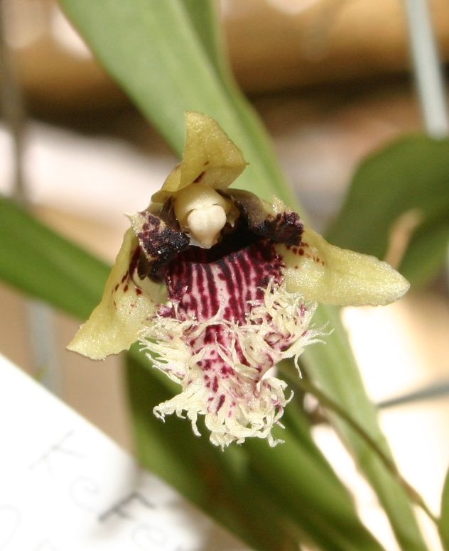 Found in western Ecuador at elevations of 100 to 450 meters as a small sized, hot growing epiphyte with a fan shaped growth carrying distichous, narrowly lanceolate, attenuate to the conduplicate, narrow, petiolate base leaves that blooms at most any time of the year on an axillary, horizontal, to 2" [5 cm] long, single flowered inflorescence