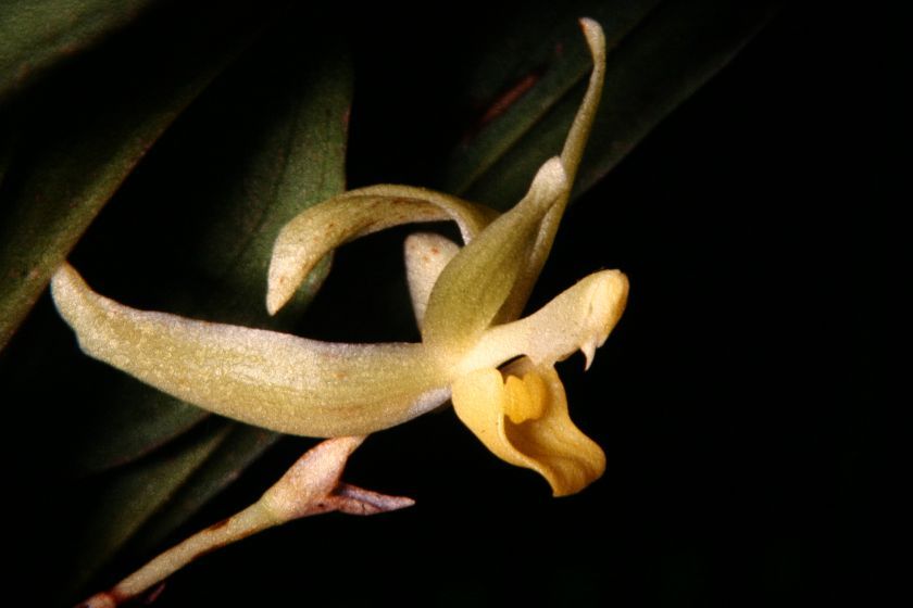 Found in eastern Ecuador at elevations of 1700 to 2000 meters in extremely wet montane forests as a small to medium sized, cool growing epiphyte with narrowly elliptic, acute, narrowing below into the slender, conduplicate base leaves that blooms in the spring and summer on a basal, arising through the axils, erect, 1.6" [4 cm] long, single flowered inflorescence with one triangular bract.