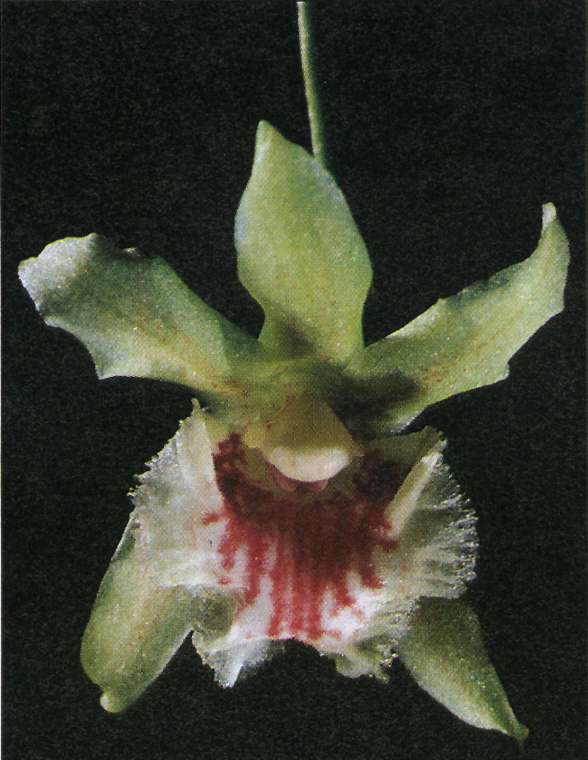 Found in Bolivia at elevations around 1900 meters as a small to medium sized, cool growing epiphtye with 4 to 5, narrowly lanceolate becoming conduplicate below into the base leaves on a pendant, 2" [5 cm] long, single flowered inflorescence with 3 triangular bracts.