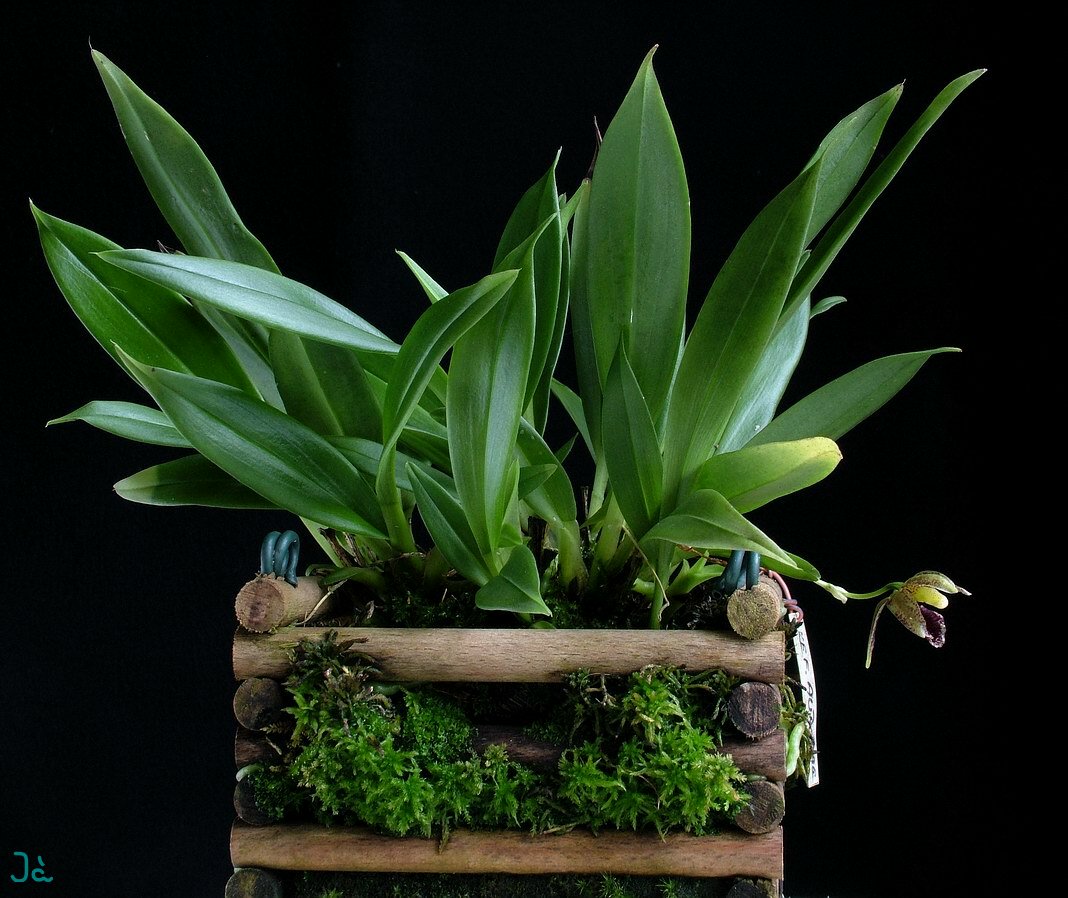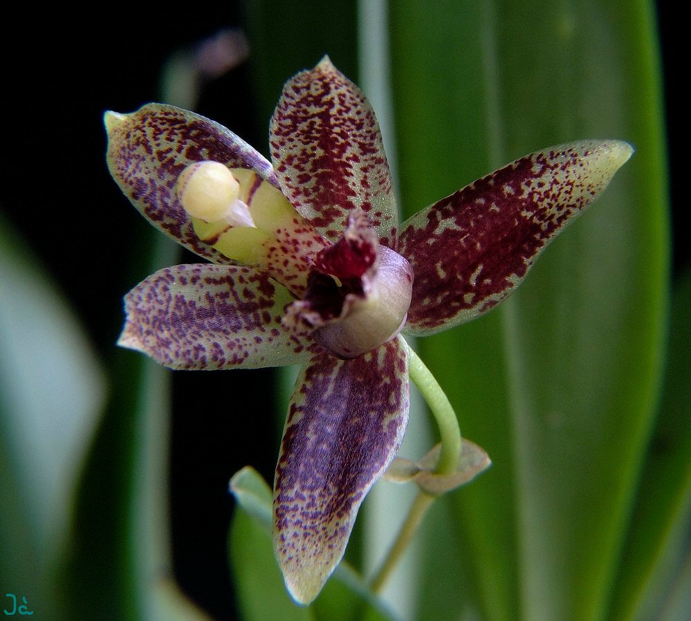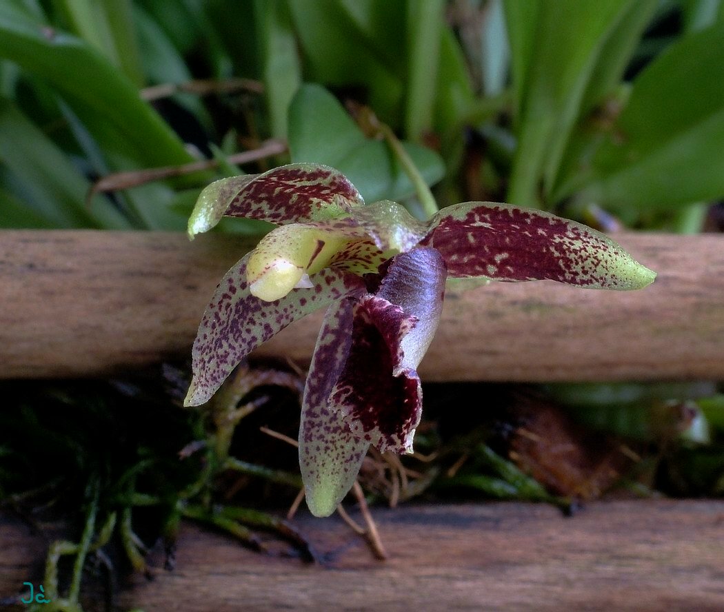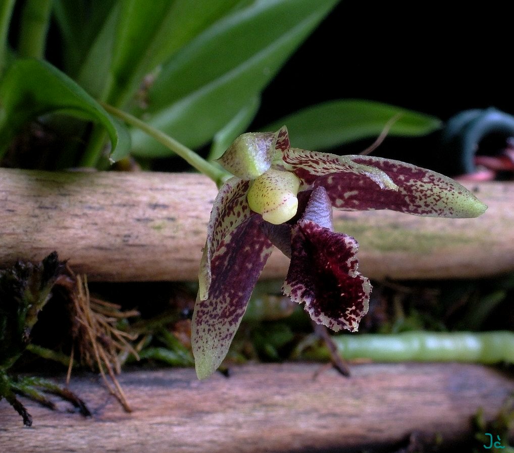 Found in Peru in wet montane forests at elevations around 900 meters as a mini-miniature to miniature sized, warm growing epiphtye with a fan of several, lanceolate, carinate midvein, acuminate, articulate below into the conduplicate base leaves that blooms in the spring and again in the fall on multiple, axillary, 1" [2.5 cm] long, single flowered inflorescence