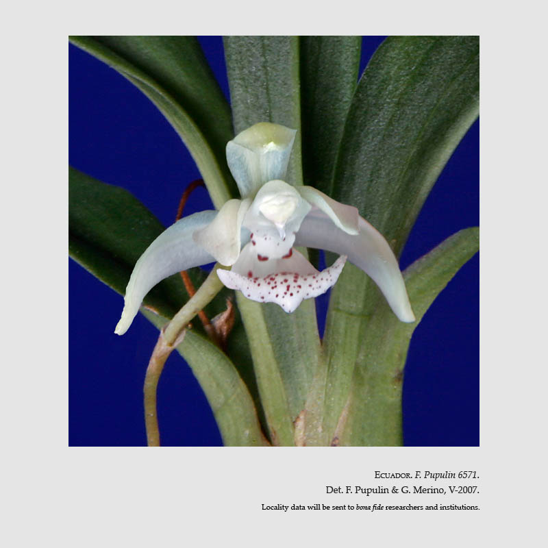 Found in Ecuador at elevations around 1200 meters as a mini-miniature sized, warm growing epiphyte with an abbreviated stem enveloped completely by 4 to 6, imbricating, sheaths and carrying narrowly oblanceolate-elliptic, acute to abruptly acuminate, narrowing below into the conduplicate, petiolate base leaves that blooms in the fall on a slender, suberect to arching pendant, 1" [2.5 cm] long, single flowered inflorescence.