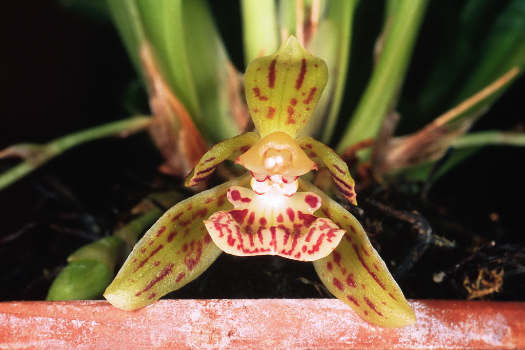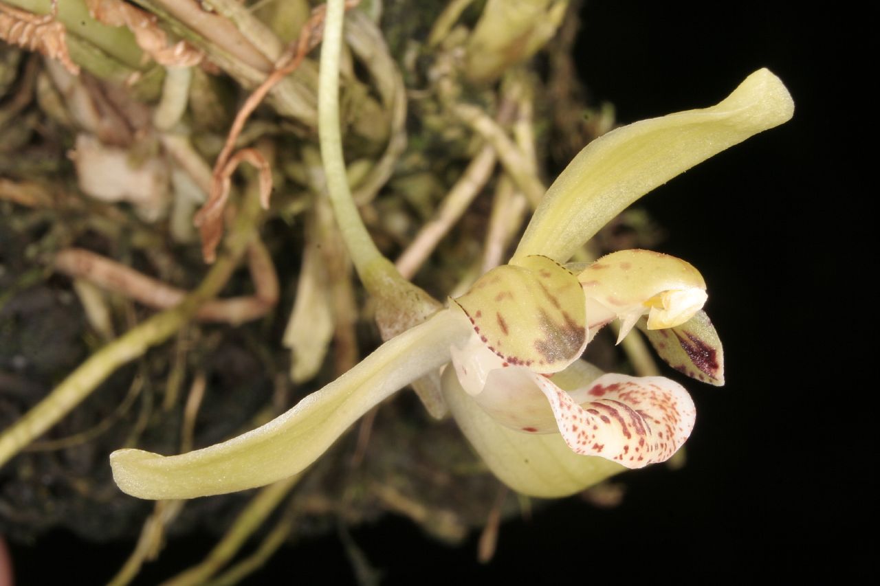 Found in northwestern Ecuador and Colombia in wet, montane cloud forests as a miniature sized, warm growing epiphyte at elevations of 600 to 1500 meters and has no pseudobulbs with an erect, short stem enveloped completely by several distichous, erect to spreading, linear-lanceolate, acute leaves that are articulated basally to the leaf sheaths and blooms in the winter and spring on an axillary, horizontal, 1.2" [3 cm] long, single flowered inflorescence .