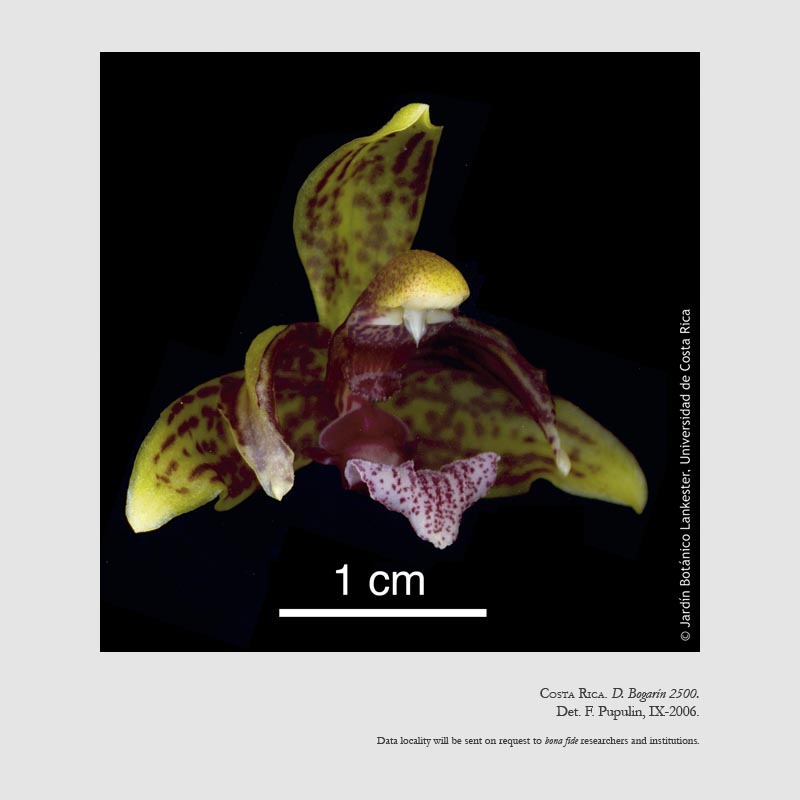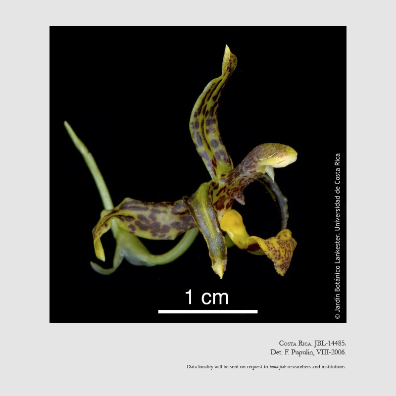 Found in Colombia, Panama and Costa Rica as a miniature sized, warm to cool growing epiphyte in premontane forests in deep shade at elevations of 700 to 1500 meters with a fan shaped growth without pseudobulbs and several, imbricate, conduplicate, leaf-bearing sheaths carrying spathulate-oblanceolate, acute, basally conduplicate leaves that blooms in the late spring and summer on a lateral, 2 to 3.08" [5 to 7.7 cm] long, single flowered inflorescence subtended by triangular bracts.