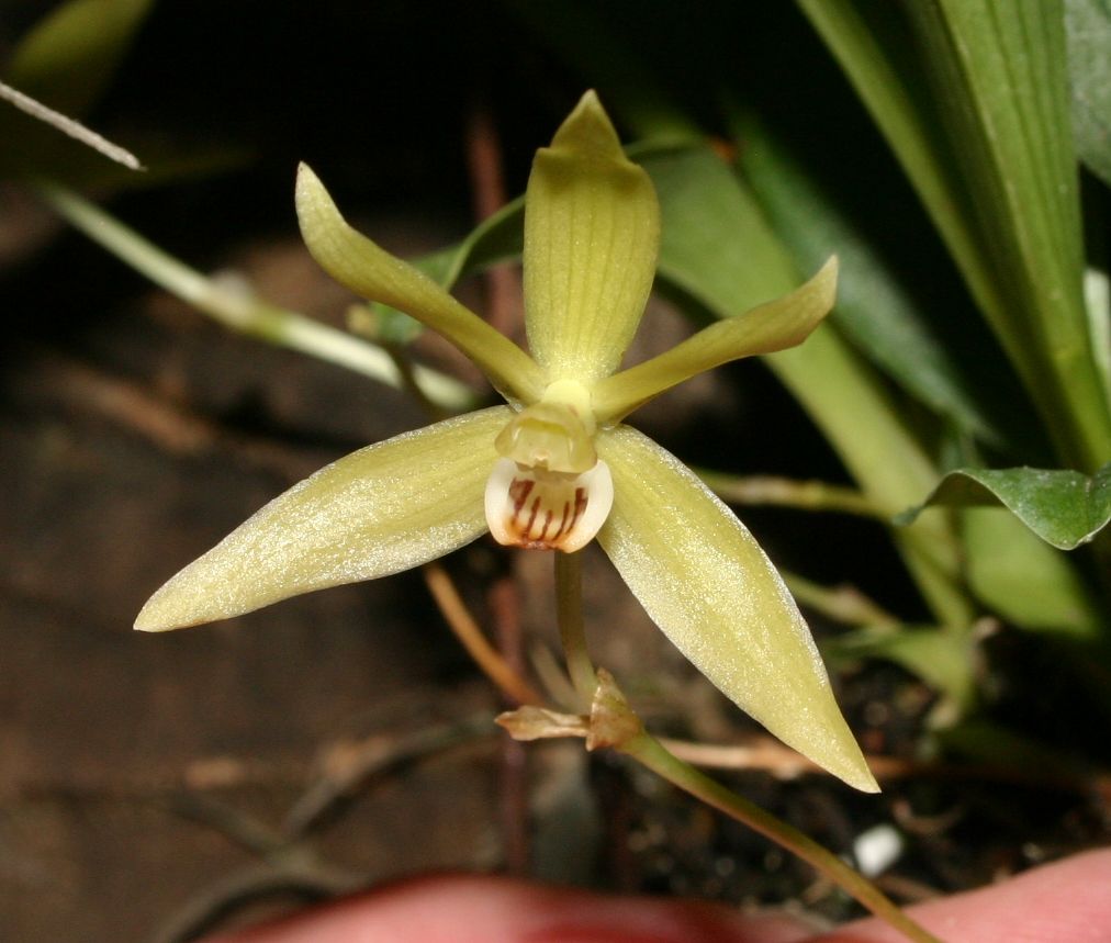 Found in Colombia at elevations around 500 meters as a miniature sized, hot to warm growing epiphyte with 3 to 4, oblanceolate-elliptic to elliptic, acute to acuminate, narrowing below into the conduplicate, petiolate base leaves that blooms in the spring on a pendant, 2.4 to 2.8" [6 to 7 cm] long, single flowered inflorescence with 2 to 3, elliptic, infundibular, acute bracts.