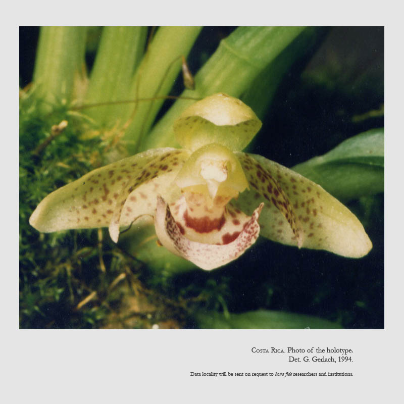 References W3 Tropicos, Kew Monocot list , IPNI ; Lankester's Epidendra Website CR ; Brenesia 41: 100. 1994 [1995 nom invalid.; *Brenesia 52: 75. 2000; Rudolf Schlechter Die Orchideen Band 1C lieferung 44-45 pg 2763 - 2898 Brieger 2001; Manual de Plantas de Costa Rica Vol 3 Hammel, Grayum, Herrera and Zamora 2003; Vanishing Beauty, Native Costa Rican Orchids Vol 1 Pupulin 2005 photo fide; AOS Bulletin Vol 75 No 4 2006 photo fide; Huntleya and Related Orchids Harding 2008 photo fide; AOS Bulletin Vol 85 #4 2016 drawing fide;