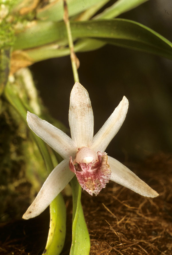 Found in Bolivia in humid montane forests as a miniature to small sized epiphyte with a loose fan of a few leaves that blooms in the early summer on an axillary, semipendent, 2.8 to 3.2" [7 to 8 cm] long, single flowered inflorescence with 3 bracts.