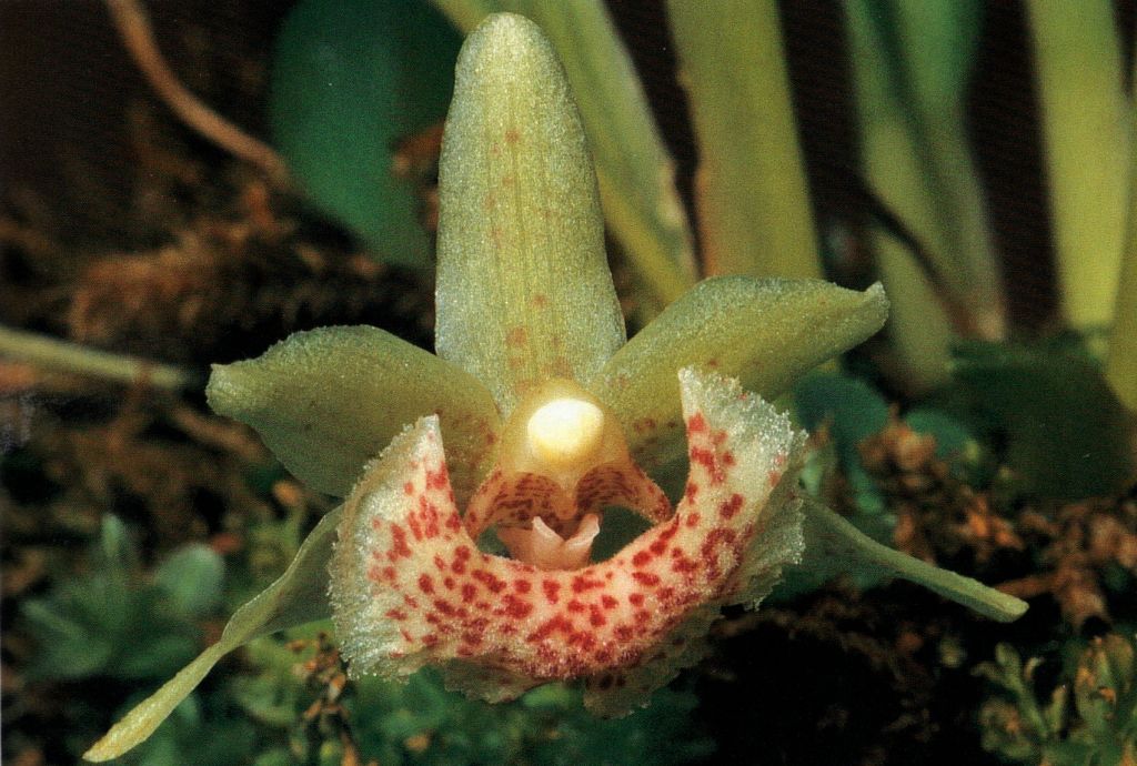 Found in Colombia, Ecuador, Peru, Bolivia and Venezuela in dense subtropical montane forests in deep shade low down on slender trees at altitudes of 800 to 2400 meters as a miniature to small sized, warm to cold growing epiphyte with a few imbricating, conduplicate, leaf-bearing sheaths carrying oblanceolate to linear-oblanceolate, acute, minutely apiculate, gradually narrowing below into the conduplicate base leaves that blooms in the summer until fall on an axillary, erect, 2" [5 cm] long inflorescence carrying a solitary, thin textured flower that is held below the leaves.