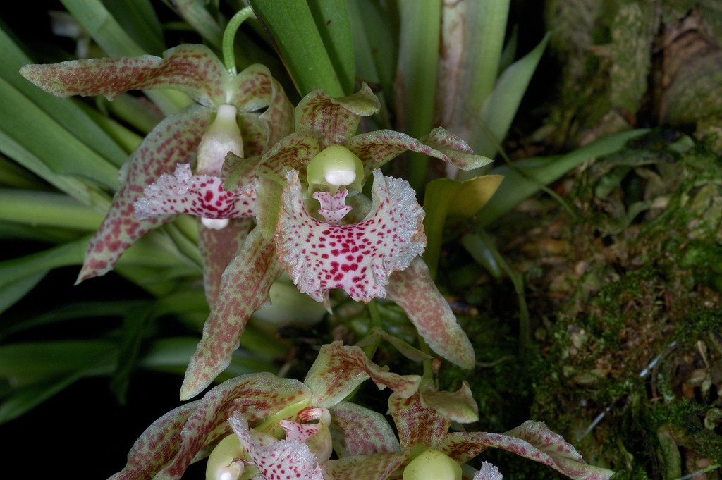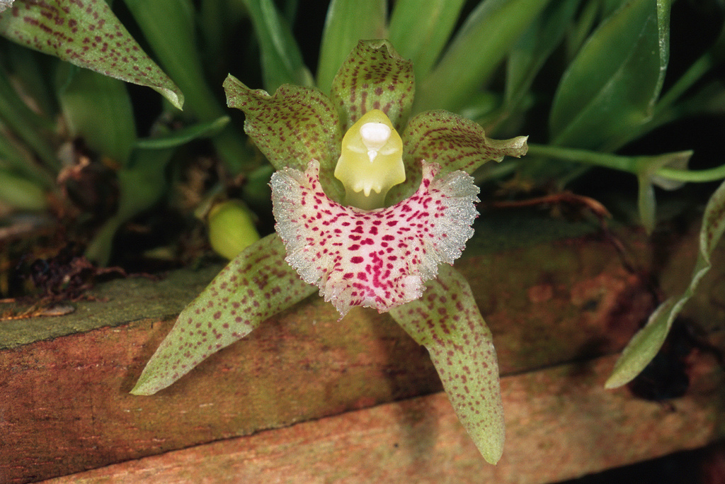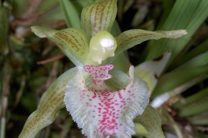 Found in Colombia and Ecuador in extremely wet montane forests at elevations of 1800 to 2100 meters as a small sized, cool growing epiphyte with a short rhizome, an erect stem that is enveloped completely by the conduplicate sheathing bases of distichous, imbricating, elongate, narrow, thin, strap-shaped leaves that blooms in the summer on an axillary, from the basal leaves, 2" [5 cm] long, single flowered inflorescence holding the flower at mid leaf.