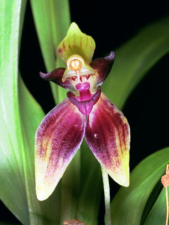 Found in Colombia at elevations of 1000 to 1500 meters as a small sized, cool growing epiphyte with a a fan of narrowly oblanceolate, conduplicate, acute narrowing below into the sheath base leaves that blooms in the late winter and early spring on a semi-erect to pendant, provided with 2 to 3, elliptic, infundibuliform, acute bracts, 1.2 to 1.8" [3 to 4.5 cm] long, single flowered inflorescence with 2, elliptic, acute, shorter than the ovary floral bracts.