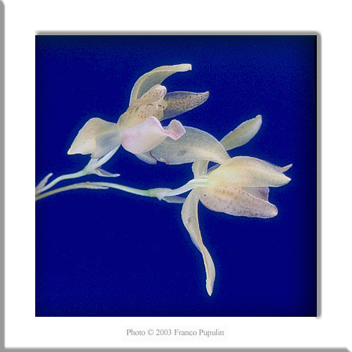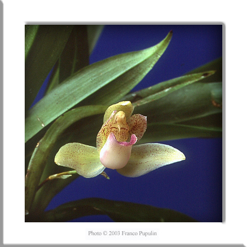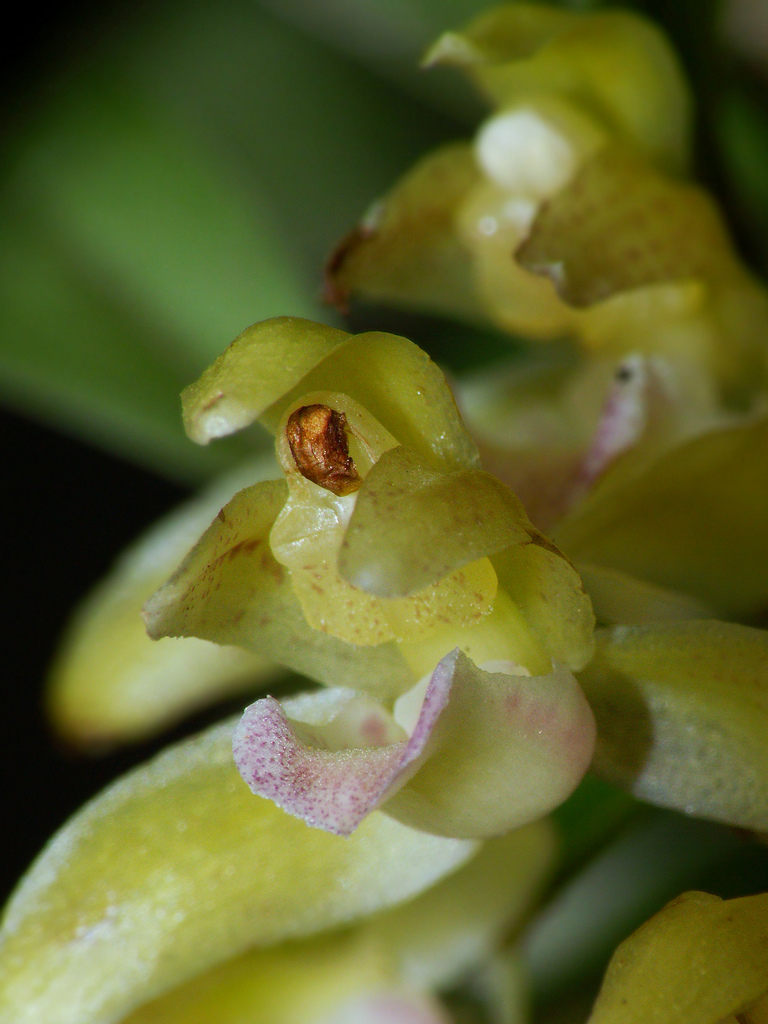 Found in Costa Rica on the Atlantic slope, in premontane rain forest to cloud forest and disturbed primary forests at elevations around 1000 to 1100 meters as a small sized, warm to cool growing epiphyte with 4 to 5, lanceolate to oblanceolate, acuminate leaves that blooms in the late spring and early summer on a pendant, .4 to 1.6" [1 to 4 cm] long, single flowered inflorescence with 3 to 4 bracts.