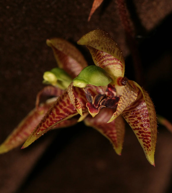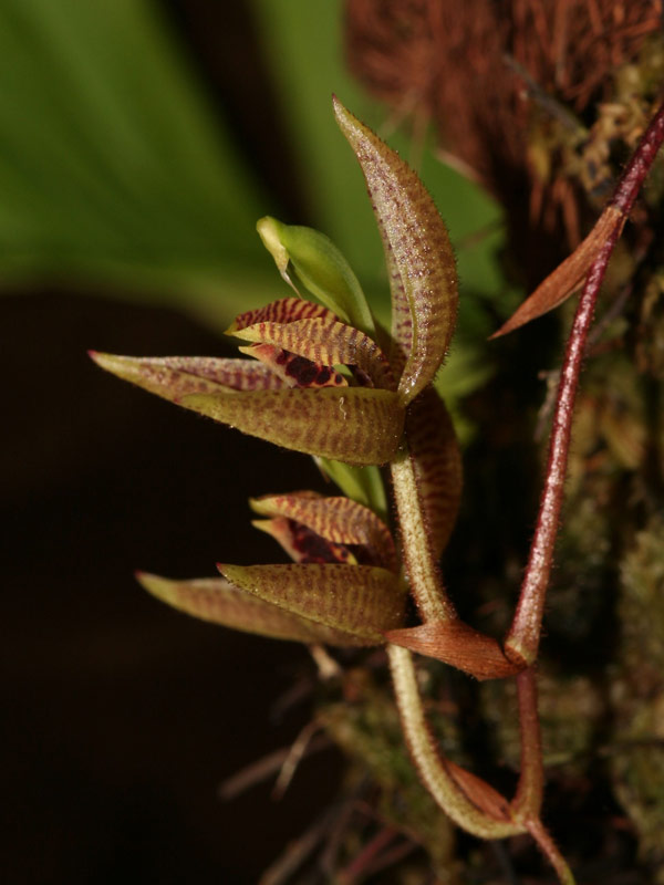 Kegeliella kupperi The habit of Kegeliella is rather similar to Gongora but somewhat smaller than these. K. kupperi has two-leaved, slightly compressed, angulate pseudobulbs that stand close together and are about 2,5 cm in height and some 2 cm in diameter. The leaves are 10 to 15 cm in length, are shiny olive green, ribbed and with dark red backsides. The pendant inflorescence emerges from the bottom of the pseudobulbs, has a length of about 8 to 12 cm, is loosely covered with brown hairs and carries some 4 to 8 flowers. These are triangular, cream-coloured and heavily marked and spotted with dark brown; the column is apple-green and makes an attractive contrast to the rest of the flower. They last about 1 to 2 weeks. I grow K. kupperi in a small basket warm to hot and with constant moisture, which they seem to require as they occur in rather wet forests on mountain ridges, low to the ground on mossy tree trunks and branches in Belize, Costa Rica, Panama and Colombia at elevations of 100 to 1000 meters where they bloom in the summer with slightly musky scented flowers.
