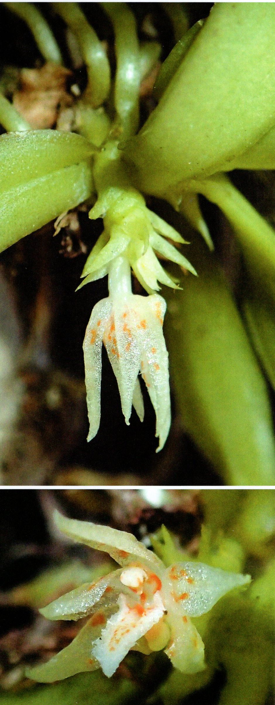 Found in Sabah Borneo in heath forests at elevations around 1000 meters as a mini-miniature sized, warm to cool growing epiphyte with a descending to spreading, leafy for most of its length, slightly compressed stem carrying several, spreading, falcate, strap shaped to unequally obovate, green, thick, apically obtuse and unequally bilobed with obtuse to acute lobules leaves with basal sheaths loosely clasping stem, green, thick persistent basal leaf sheaths that blooms in the summer on several at a time, lateral, emerging from the leaf axil, descending, peduncle .06 to .068" [1.5 to 1.7 mm] long, widening towards the apex, green, .16 to .3" [4 to 7.5 mm] overall, terminating in an ovate, fleshy bracts, successively single, to 12 flowered inflorescence with crowded, quaquaversal, triangular, longitudinally folded, pale green, persistent, longer than the ovary floral bracts and carrying ephemeral flowers that do not open well.