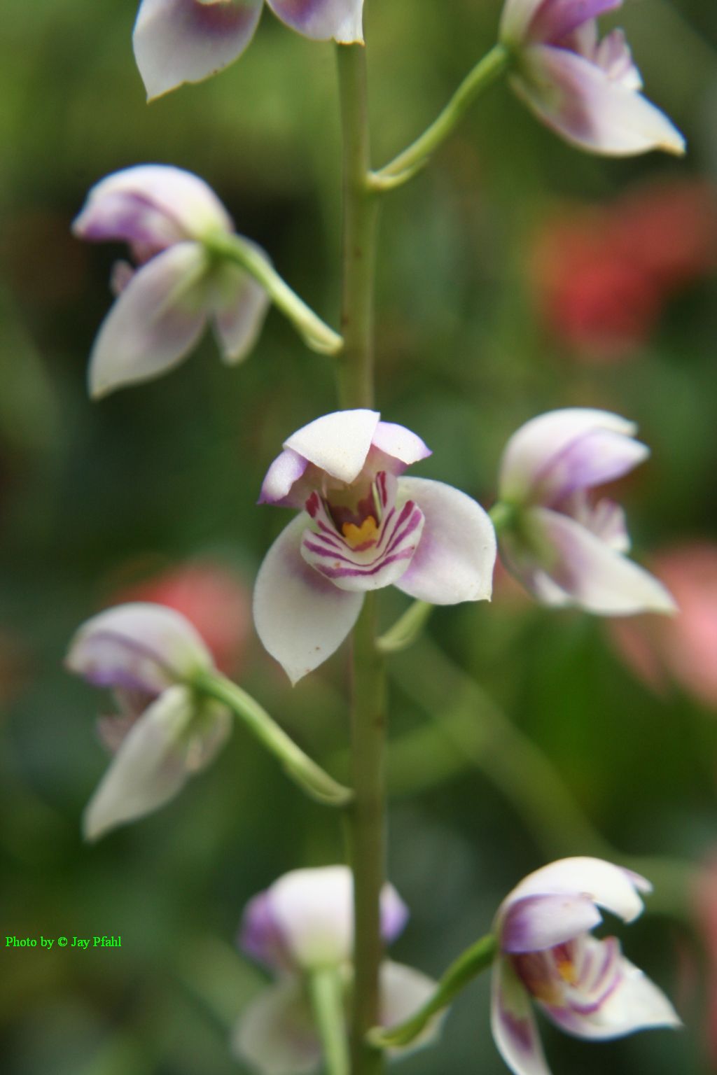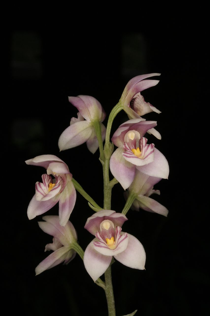 Found in Ecuador and Peru at elevations of 900 to 2000 meters as a small sized, warm to cool growing terrestrial with a short leafy stem thickened into a narrowly ovoid, prolonged into a slender, cauliform neck and carrying a single, apical, erect, lanceolate-elliptic, acute to acuminate, narrowing below leaf with 3 nerves beneath and blooms in the fall on a basal, lateral, erect, somewhat stout, 18" [45 cm] long, 9 to 15 flowered, racemose inflorescence with a few remote small, tubular sheaths and small, inconspicuous floral bracts.