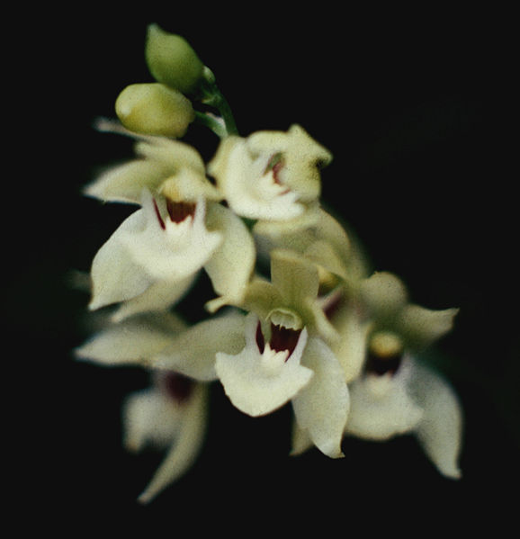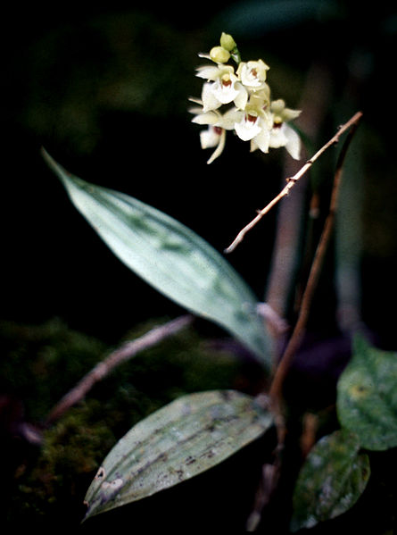 Found from Venezuela, French Guiana and Surinam in wet forests at altitudes around 500 meters as a small sized, hot to warm growing terrestrial with cylindric pseudobulbs completely enveloped by imbricating sheaths and carrying, a single, plicate, elliptic, acute, gradually narrowing below into the petiolate base leaf that is completely enveloped by grey and brown nervose, scarious sheaths and blooms in the spring on an erect, terete, smooth, dark maroon-red basally and grading to pale green at the raceme, to 12" [30 cm] long, several flowered inflorescence with a few pale pink-brown bracts and pale green floral bracts