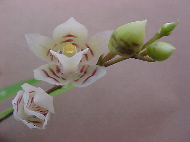 Found from Venezuela, Colombia, Ecuador, Peru and Trinidad in wet forests, in humid montane deciduous, jungle and rain forests usually in deep shade at altitudes of 120 to 2000 meters as a small sized, hot to cool growing, caespitose epiphyte with an almost closed fan-shape made up of stems that are encased by imbricating, articulating leaf bearing sheaths with linear, grass-like, acute leaves with a conduplicate base that graduate in size from the base that blooms in the spring, summer and fall on a lateral, bracteate, erect, to 5" [12.5 cm] long, slender, few to 15 flowered, racemose inflorescence with successive opening flowers that is just short of the length of the leaves.