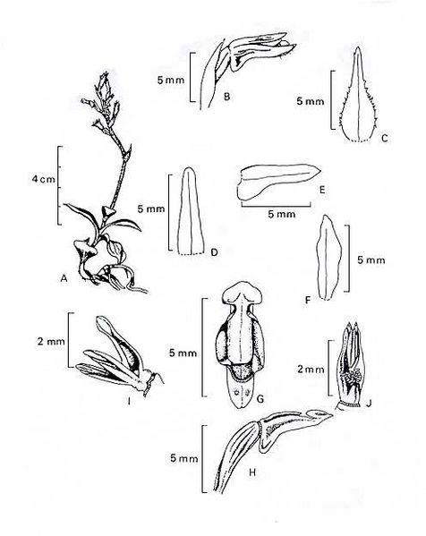 Found in Papua New Guinea as a miniature sized terrestrial with an ascending stem carrying 5 or so, ovate-lanceolate leaves that blooms on a terminal, erect, pubescent, few flowered inflorescence