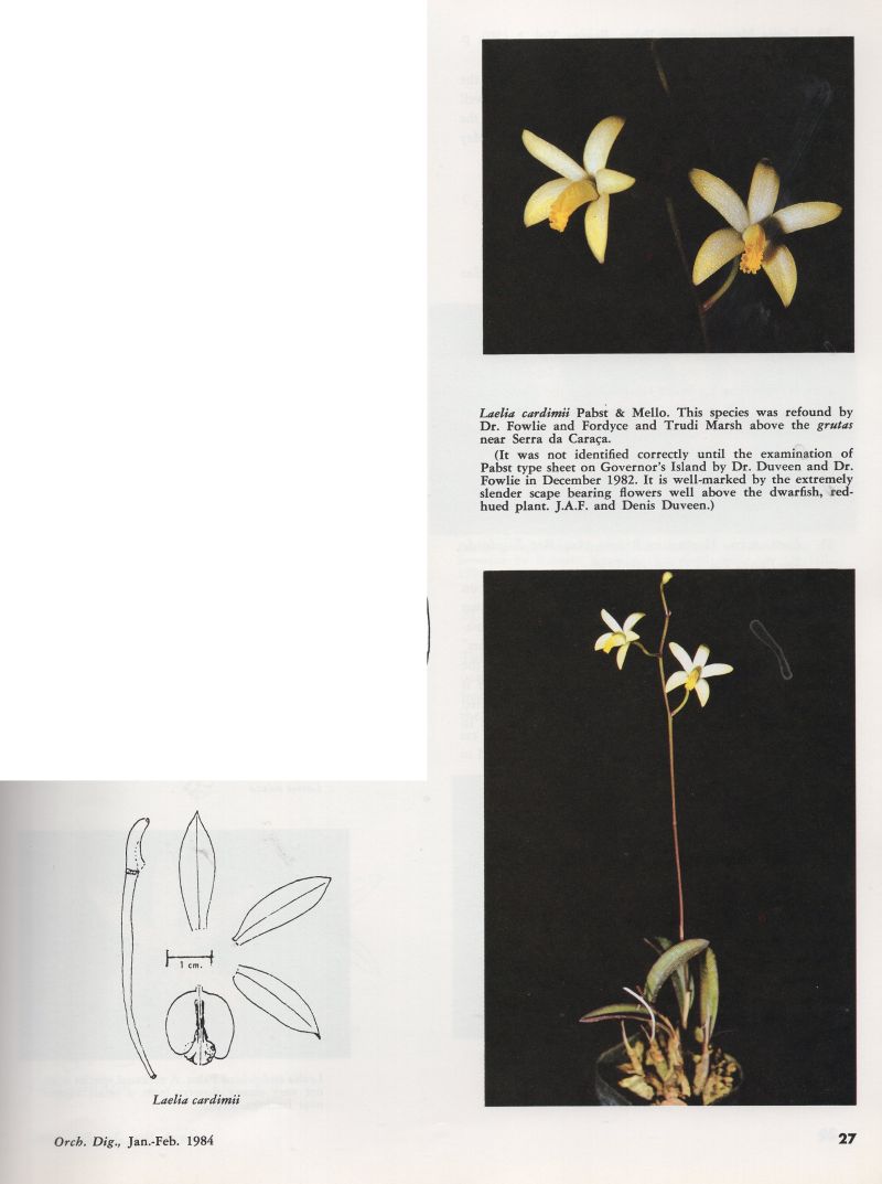 References W3 Tropicos, Kew Monocot list , IPNI ; Orchidaceae Brasilienses Pabst & Dungs Band I 1975 drawing fide; Orchid Digest Vol 45 No 3 1981 photo ok; Orchid Digest Vol 48 No 1 1984 as L cardimii photo fide; Orchid Digest Vol 48 No 1 1984 photo fideCattleya and Their Relatives Vol 2 Withner 1990 photo ok; Cattleya and Their Relatives Vol 2 Withner 1990 as L cardimii photo ok; Lindleyana Vol 15 No 2 2000 as Sophronitis blumenscheinii; Rudolf Schlechter Die Orchideen Band 1C lieferung 42 - 43 pg 2626 - 2762 Brieger 2001 as L cardaminii spelling; Orchidees Du Bresil As Orchideas da Serra Do Castello Vol 3 Chiron & Bolsanello 2013 as Hoffmannseggella blumenscheinii drawing/photo fide