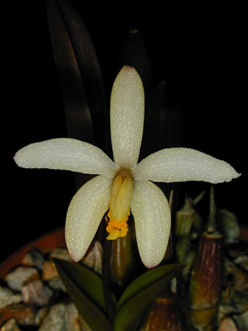 Found in Minas Gerais Brazil on ledges of rocky outcrops at elevations of 1100 to 1800 meters as a mini-miniature sized, cool growing epiphyte with narrowly conical pseudobulbs carrying a single, apical, erect, scoop-like, leathery, rigid, succulent, narrowly elliptic to oblong, acute, that blooms in the summer and fall on a terminal, to .6" [1.5 cm] long, simultaneously 3 to 7 flowered inflorescence.