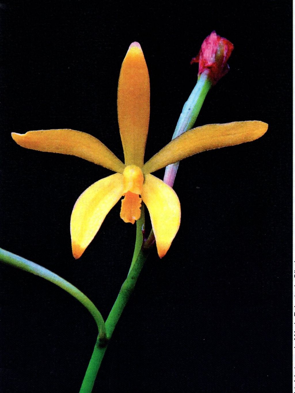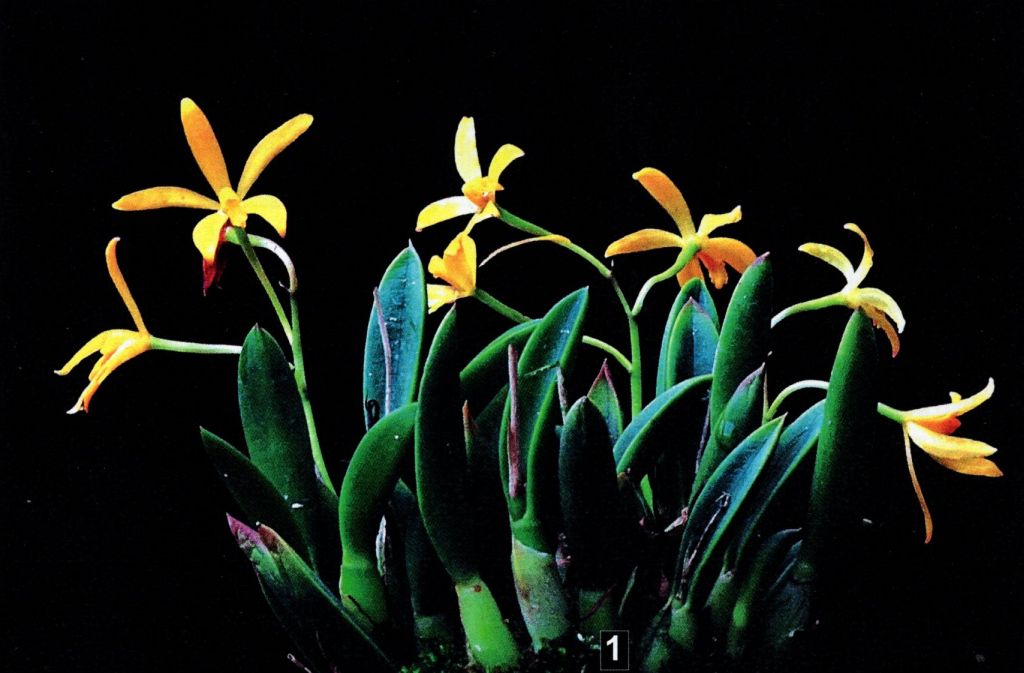 Found in Minas Gerais state of Brazil on rocky outcrops at elevations around 1425 meters as a mini-miniature sized, cool growing saxicolus terrestrial with an inconspicuous rhizome giving rise to clear green, obclavate pseudobulbs enveloped by green, papery, deciduous sheaths and carrying a single, dark green, erect, coriaceous, elliptic, cannoe-shaped, apiculate, conduplicate into the base leaf that blooms in the summer on a terminal, erect, arising through a green, transluscent, linear-truncate, oblique spathe, rachis, short, green, cylindrical, to 1.68" [4.2 cm] long, simultaneously 2 to 3 flowered inflorescence and carrying yellow flowers held in the upper third of the inflorescence.